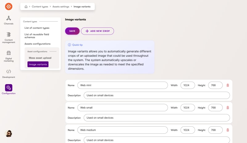 In practice, all technical parameters—such as dimensions, resolutions, file formats, file size limits, and more—can be predefined by developers and automatically optimized. Content marketers can simply upload their images to Xperience by Kentico, and the system will handle all necessary processing for them.
