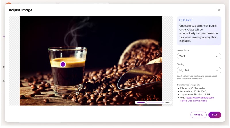 AIRA automates format conversion and image quality optimization during mass uploads. You can set up crop optimization, configure target image variants, and enable automatic resizing, cropping, file format adjustments, and more.